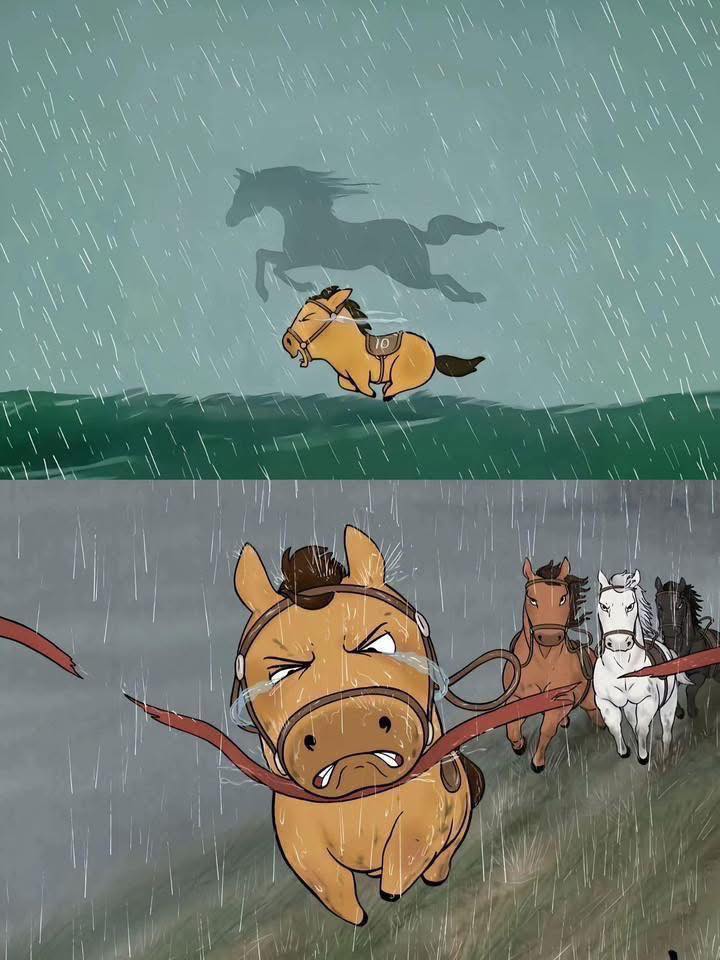 Dưới đây là bộ ảnh meme nổi tiếng về Mã Tiểu Dã (小野马 / Xiǎo Yě Mã) – chú ngựa con "vừa chạy vừa khóc" đang gây bão mạng xã hội cuối năm 2025. Nhân vật này tượng trưng cho việc cố gắng hết sức dù biết mình không phải "ngựa chiến" mạnh nhất, rất được gen Z yêu thích vì sự dễ thương và đồng cảm.